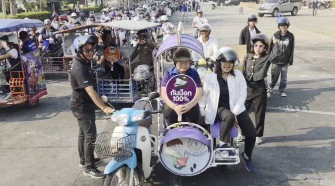 นายอำเภอสาวอู่ทอง นั่งซาเล้งลงเนินไปแจกหมวกนิรภัยรณรงค์ขับขี่ปลอดภัย