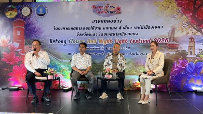 เมื่อวันที่ 10 เมษายน 2569 ที่ห้องอาหารสุดสยาม ชั้น 4 อำเภอเบตง จังหวัดยะลา นายใช้ วงศ์นิตยลัภย์ นายกเทศมนตรีเมืองเบตง พร้อมด้วย นิรันดร์ สุนทรศิริ ปลัดอาวุโสอำเภอเบตง และนายนรินทร์ เรืองวงศา นายกสมาคมธุรกิจการท่องเที่ยวอำเภอเบตง ร่วมแถลงข่าวการจัดงาน “เทศกาลดอกไม้บาน และแสง สี เสียง เสน่ห์เมืองเบตง” เตรียมจะจัดขึ้นระหว่างวันที่ 12 เมษายน – 4 พฤษภาคม 2569 ในพื้นที่เขตเทศบาลเมืองเบตง เพื่อกระตุ้นเศรษฐกิจและส่งเสริมการท่องเที่ยวสู่ใต้สุดสยาม