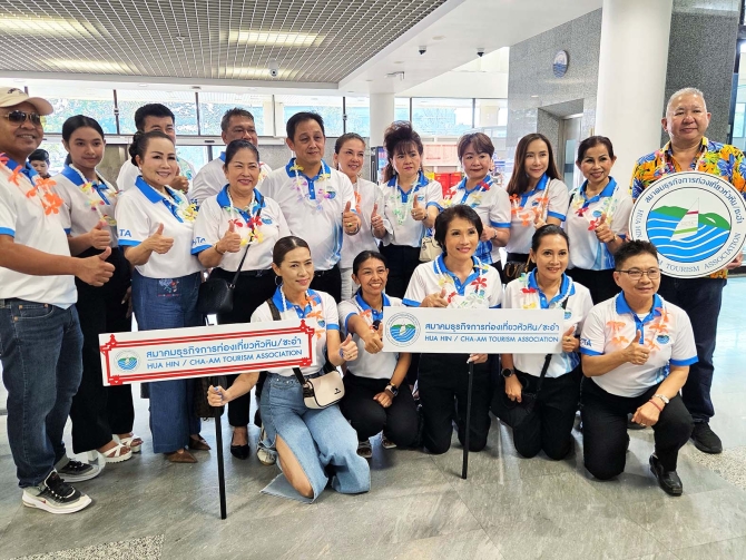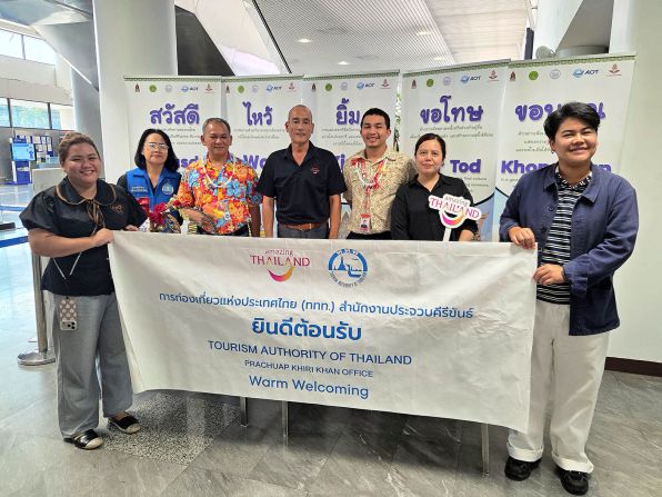 เมื่อวันที่ 10 เม.ย.69 ที่ท่าอากาศยานหัวหิน จ.ประจวบฯ นายอิษฎา เสาวรส ผู้อำนวยการการท่องเที่ยวแห่งประเทศไทย (ททท.) สำนักงานประจวบฯ นายกิติพงษ์ สิริเพชรเกษม นายกสมาคมธุรกิจท่องเที่ยวหัวหิน/ชะอำ น.ส.ชนัตถา ศรีเจริญ ผู้อำนวยการท่าอากาศยานหัวหิน นายเจนวิท ผลิศักดิ์ สาธารณสุข อ.หัวหิน และแขกผู้มีเกียรติร่วมให้ต้อนรับนักท่องเที่ยวชาวไทยและชาวต่างชาติที่เดินทางจาก จ.เชียงใหม่ ด้วยเที่ยวบินแอร์เอเซีย FD 3900 มาลงยังท่าอากาศยานหัวหิน เต็มลำจำนวน 161 คน เพื่อท่องเที่ยวหัวหินในช่วงสงกรานต์ พร้อมกันนี้ทางคณะได้มอบของที่ระลึก อาทิ ปืนฉีดน้ำ แว่นตา ที่ติดกระเป๋า สายรัดกระเป๋า ผลิตภัณฑ์จากชุมชน และแม่เหล็กติดตู้เย็น แจกให้กับผู้โดยสารด้วยบรรยากาศอบอุ่น