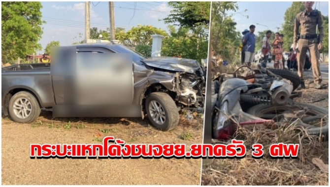 สลดรับสงกรานต์ กระบะแหกโค้ง ชน จยย. ดับยกครัวพ่อแม่ลูก 3 ศพ