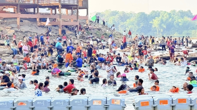 ขณะที่ “แก่งสะพือ” อ.พิบูลมังสาหาร กลับมาคึกคักอีกครั้ง หลังระดับน้ำลดลงจนเผยให้เห็นโขดหินกลางลำน้ำมูล กลายเป็นแหล่งท่องเที่ยวสำคัญในช่วงเดือนเมษายน โดยเทศบาลเมืองพิบูลมังสาหารจัดงาน “มหาสงกรานต์แก่งสะพือ PHIBOON CITY 2026” ตลอดเดือนเมษายน พร้อมพิธีเปิดเมื่อวันที่ 13 เมษายน ท่ามกลางประชาชนและนักท่องเที่ยวเข้าร่วมอย่างหนาแน่น