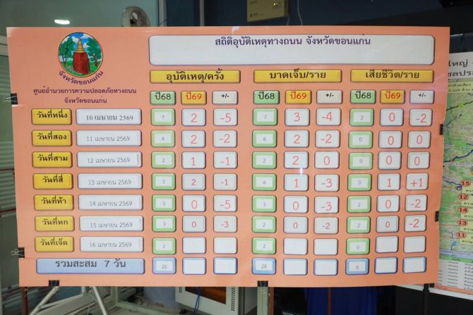 นายโสภณ เจริญพร หัวหน้าสำนักงานป้องกันและบรรเทาสาธารณภัยจังหวัดขอนแก่น เปิดเผยว่า วันที่ 15 เมษายน ซึ่งเป็นวันที่ 6 ของการรณรงค์ ไม่เกิดอุบัติเหตุ ไม่มีผู้บาดเจ็บและผู้เสียชีวิต สะท้อนผลการทำงานเชิงรุกของทุกภาคส่วน