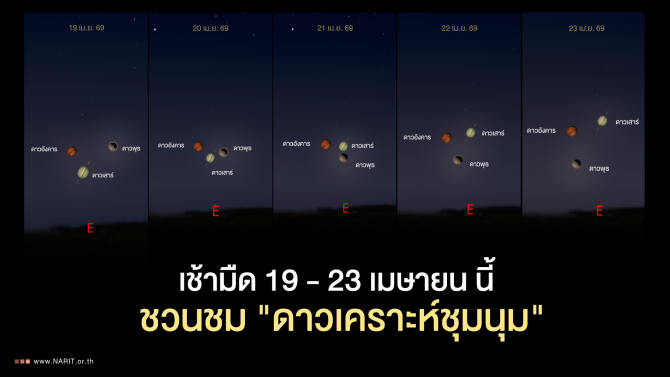 นายศุภฤกษ์ คฤหานนท์ ผู้ช่วยผู้อำนวยการสถาบันวิจัยดาราศาสตร์แห่งชาติ เปิดเผยว่า ตั้งแต่วันพรุ่งนี้ 19 เมษายน 2569 เป็นต้นไปในช่วงเช้ามืด จะเกิดปรากฏการณ์ "ดาวเคราะห์ชุมนุม" ซึ่งจะมีดาวเคราะห์ 3 ดวง ได้แก่ ดาวอังคาร ดาวพุธ และดาวเสาร์ ปรากฏใกล้กันบนท้องฟ้าทางทิศตะวันออก โดยมีจังหวะการเข้าใกล้กันที่น่าสนใจดังนี้