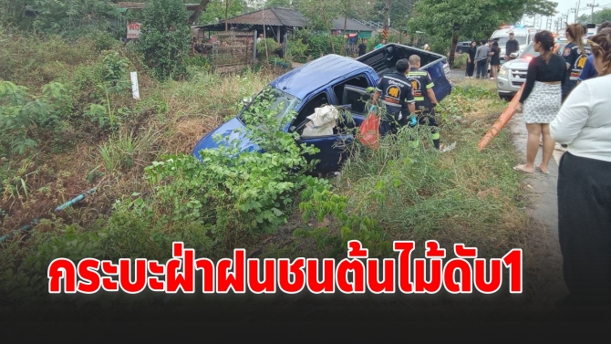 สลด! พายุฝนซัดกระบะเสียหลักชนต้นไม้ ภรรยาดับ สามีรอดหวุดหวิด