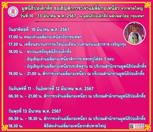 ระหว่างวันที่ 10–13 มีนาคม 2567 มูลนิธิป่อเต็กตึ๊ง ร่วมกับมูลนิธิมิตรภาพสามัคคี (ท่งเซียเซี่ยงตึ๊ง) หาดใหญ่ ขอเชิญศิษยานุศิษย์ และสาธุชนที่เลื่อมใส ร่วมสักการะเจ้าแม่ลิ้มกอเหนี่ยวจากหาดใหญ่ องค์ฮกเต็กแป๊ะกง และองค์นาจาไท้จื้อ (เทพโกมินทร์) ณ บริเวณลานสำนักงาน มูลนิธิป่อเต็กตึ๊ง พลับพลาไชย กรุงเทพฯ โดยวันอาทิตย์ที่ 10 มีนาคม 2567 เวลา 17.30 น. คณะเจ้าแม่ลิ้มกอเหนี่ยวเดินทางถึงกรุงเทพฯ ผ่านบริเวณวงเวียนโอเดียน ไปตามถนนเยาวราช-เจริญกรุง โดยขบวนจะแห่ถึงมูลนิธิป่อเต็กตึ๊ง เวลาประมาณ 18.00 น. และในวันที่ 11-12 มีนาคม 2567 มูลนิธิป่อเต็กตึ๊งเปิดให้ผู้มีจิตศรัทธาเข้าสักการะตั้งแต่เวลา 06.30–21.00 น. สำหรับวันพุธที่ 13 มีนาคม 2567 เวลา 18.30 น. จะมีพิธีส่งเจ้าแม่ลิ้มกอเหนี่ยวกลับหาดใหญ่
