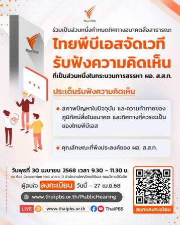 องค์การกระจายเสียงและแพร่ภาพสาธารณะแห่งประเทศไทย (ส.ส.ท.) หรือไทยพีบีเอส ขอเชิญผู้สนใจเข้าร่วมเวทีรับฟังความคิดเห็น ซึ่งเป็นส่วนหนึ่งของกระบวนการสรรหาผู้อำนวยการ ส.ส.ท. เพื่อแสดงความคิดเห็นของท่าน องค์กร หรือเครือข่ายเกี่ยวกับ 1. สภาพปัญหาในปัจจุบัน และความท้าทายของภูมิทัศน์สื่อในอนาคต และทิศทางที่ควรจะเป็นของไทยพีบีเอส และ 2. คุณลักษณะที่พึงประสงค์ของผู้อำนวยการ ส.ส.ท. ในวันที่ 30 เมษายน 2568 เวลา 9.30 -11.30 น. ณ ห้อง Convention Hall อาคาร D สำนักงานใหญ่ไทยพีบีเอส ถนนวิภาวดีรังสิต กรุงเทพฯ