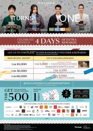 และตอกย้ำความเป็นแลนด์มาร์กแห่งไลฟ์สไตล์ใจกลางกรุงเทพฯ ด้วยการจัดกิจกรรมพิเศษ 4 DAYS OF EXTRA CELEBRATIONS & REWARDS ระหว่างวันที่ 23 ถึง 26 ตุลาคม 2568 เติมสีสันการเฉลิมฉลองด้วยคอนเสิร์ต 4 วันเต็ม พร้อมสิทธิพิเศษและโมเมนต์ที่น่าจดจำ เริ่มจากวันที่ 23 ตุลาคม เวลา 19.00 น. พบกับ Tilly Birds และเวลา 20.30 น. สนุกกันต่อกับ Proxie ถัดมาที่วันที่ 24 ตุลาคม เวลา 20.30 น. พบกับ เติ้ล–เฟิร์สวัน สำหรับวันที่ 25 ตุลาคม เวลา 19.30 น. ร่วมอินไปกับ Serious Bacon และเวลา 21.00 น. พบกับโชว์สุดพิเศษจาก บิวกิ้น-พุฒิพงศ์ ก่อนจะปิดท้ายอย่างยิ่งใหญ่ในวันที่ 26 ตุลาคม เวลา 19.00 น. กับ Fellow Fellow และเวลา 20.30 น. กับโชว์สุดเอ็กซ์คลูซีฟจากปาล์มมี่ ที่จะมอบประสบการณ์ความบันเทิงเหนือระดับให้ผู้ร่วมงานที่โซน The Storeys Square โดยเป็นสิทธิพิเศษสำหรับสมาชิก One Bangkok เท่านั้น