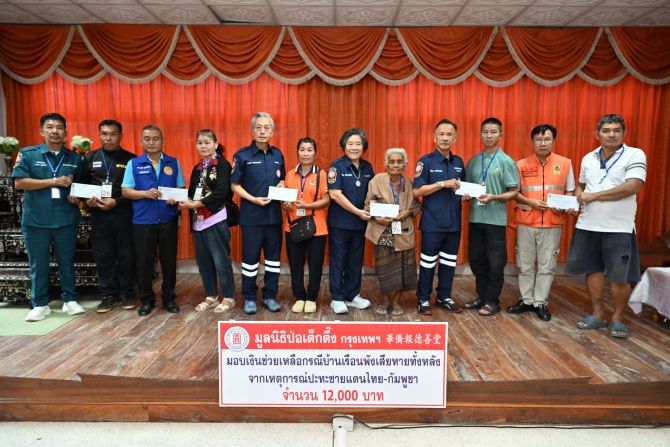 เมื่อวันที่ 9 ตุลาคม 2568 มูลนิธิป่อเต็กตึ๊ง นำโดย นางจินดา บุญลาภทวีโชค กรรมการตรวจสอบ, นายชาญกิจ วิทยาวรากรณ์ กรรมการ, พร้อมด้วย นางสาวดวงชุตา ติยะพจนพรกุล ผู้ช่วยผู้จัดการฝ่ายสังคมสงเคราะห์ และ นายชุมพล บุญภักดี ผู้ช่วยหัวหน้าแผนกสาธารณภัย นำทีมเจ้าหน้าที่ฝ่ายสังคมสงเคราะห์และแผนกสาธารณภัย ลงพื้นที่อำเภอกันทรลักษณ์ จังหวัดศรีสะเกษ มอบเงินช่วยเหลือให้แก่ประชาชนที่ได้รับผลกระทบจากเหตุปะทะบริเวณชายแดนไทย–กัมพูชา กรณีบ้านพังเสียหายทั้งหลัง หลังละ 12,000 บาท รวม 32 หลัง เป็นเงินทั้งสิ้น 384,000 บาท