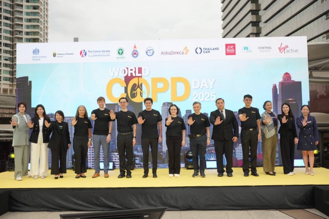 เนื่องในวันปอดอุดกั้นเรื้อรังโลก (World COPD Day) ประจำปี 2568 มูลนิธิโรคหืดแห่ง ประเทศไทย สมาคมอุรเวชช์แห่งประเทศไทยฯ และ แอสตร้าเซนเนก้า (ประเทศไทย) พร้อมด้วยภาคีเครือข่ายพันธมิตร ได้แก่ กรมควบคุมโรค, กรมการแพทย์, สำนักการแพทย์ กรุงเทพมหานคร, สถานเอกอัครราชทูตอังกฤษประจำประเทศไทย และสถานเอกอัครราชทูตสวีเดนประจำประเทศไทย สมาคมเครือข่ายอากาศสะอาดเพื่อสุขภาพ, มูลนิธิเครือข่ายมะเร็ง, ชมรมลมวิเศษ, กลุ่มเซ็นทรัล, เจนเนอราลี่ประกันชีวิต และ เวอร์จิ้น แอ็คทีฟ ร่วมจัดงานรณรงค์สร้างความตระหนักรู้ครั้งใหญ่ ภายใต้หัวข้อ “ทุกลมหายใจมีค่า หยุดความตายเงียบ จากโรคปอดอุดกั้นเรื้อรัง" ณ ลาน Skywalk สถานีรถไฟฟ้าช่องนนทรี เร่งสร้างความตระหนักรู้ และเน้นย้ำความสำคัญของการป้องกันและดูแลสุขภาพปอด จากภัยคุกคามของโรคปอดอุดกั้น เรื้อรัง
