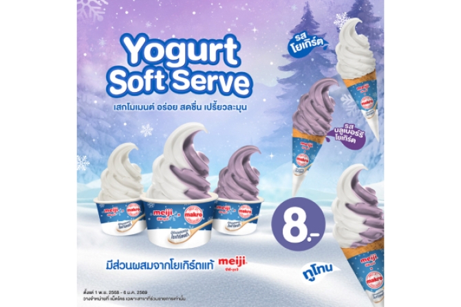 แม็คโคร และ ซีพี-เมจิ ผนึกกำลังยกระดับวงการซอฟต์เสิร์ฟ เปิดตัว 2 รสชาติใหม่ Magical Yogurt: ซอฟต์เสิร์ฟรสโยเกิร์ต หวานเปรี้ยวละมุน สดชื่น เนื้อเนียนนุ่ม Magical Berry Yogurt: ซอฟต์เสิร์ฟรสบลูเบอร์รีโยเกิร์ต หวานอมเปรี้ยวกำลังดี หอมกลิ่นเบอร์รี สายเบอร์รีต้องร้องว้าว พร้อมโยเกิร์ตแท้จากเมจิ และยังมีรสทูโทน Magical Soft Serve: ซอฟต์เสิร์ฟทูโทน 2 รสชาติในคำเดียว อร่อยละมุนราวกับต้องมนตร์ เหมือนได้ สัมผัสเวทมนตร์แห่งฤดูหนาว เพิ่มความฟินกับท็อปปิ้งราดน้ำผึ้งและพิสตาชีโอคุณภาพที่ช่วยเสริมรสชาติโยเกิร์ตซอฟต์เสิร์ฟให้อร่อยยิ่งขึ้น ราคาเริ่มต้นเพียง 8 บาทเท่านั้น พร้อมของแถมสุดพิเศษเป็นช้อนตีม คริสมาสต์สุดน่ารัก เพียงซื้อไอศกรีมแบบถ้วยพร้อมท็อปปิ้ง (ของมีจำนวนจำกัด) แวะมาลองประสบการณ์ความอร่อยกันได้ที่มุมไอศกรีมของแม็คโคร เฉพาะสาขาที่ร่วมรายการ จำหน่ายแล้ววันนี้ ถึง 6 มกราคม 2569 เท่านั้น