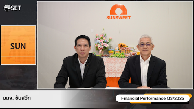 นายวีระ นพวัฒนากร (ขวา) ผู้อำนวยการฝ่ายบัญชีและการเงิน และ นายวณิชชา ณ ลำปาง (ซ้าย) ผู้อำนวยการฝ่ายขายและการตลาด บริษัท ซันสวีท จำกัด (มหาชน) หรือ SUN ให้ข้อมูลผลประกอบการงวด 9 เดือน ปี 2568 บริษัทมีรายได้จากการขายสินค้า 2,664.79 ล้านบาท เพิ่มขึ้น 6.4% และ มีกำไรสุทธิ 159.10 ล้านบาท เดินหน้าขยายตลาดทั้งในและต่