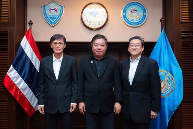 นายชูศักดิ์ วิวัฒน์วงศ์เกษม กรรมการผู้จัดการ พร้อมด้วย นายปิยะพงษ์ เวชชเศรษฐนนท์ รองกรรมการผู้จัดการอาวุโส บริษัท สตาร์ มันนี่ จำกัด (มหาชน) (STARM) ถ่ายภาพร่วมกับ นายจิรวัฒน์ ตั้งกิจงามวงศ์ ประธานสมาคมการค้ากลุ่มผลิตภั