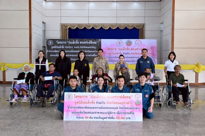วันที่ 24 ธันวาคม 2568 มูลนิธิป่อเต็กตึ๊ง ลงพื้นที่จังหวัดหนองบัวลำภู มอบรถเข็นวีลแชร์จำนวน 100 คัน พร้อมค่าพาหนะแก่ผู้พิการคนละ 500 บาท รวมงบประมาณ 290,000 บาท เพื่อบรรเทาความยากลำบากในการดำรงชีวิตและเสริมโอกาสในการช่วยเหลือตนเอง ทั้งนี้เพื่อถวายเป็นพระราชกุศลแด่สมเด็จพระนางเจ้าสิริกิติ์ พระบรมราชินีนาถ พระบรมราชชนนีพันปีหลวง ในโครงการ “ป่อเต็กตึ๊ง สงเคราะห์สังคม”