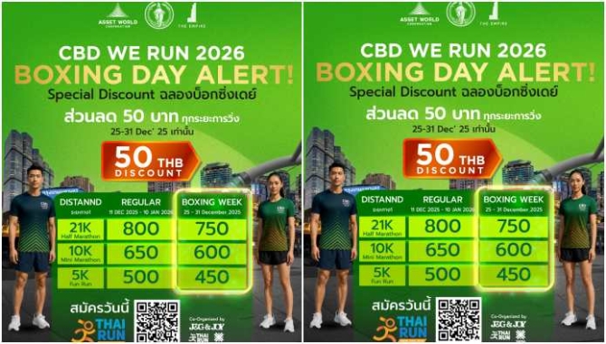 พิเศษช่วง Boxing Week เป็นของขวัญปีใหม่มอบให้ทุกท่าน ตั้งแต่วันที่ 25 – 31 ธันวาคม จะได้รับส่วนลดพิเศษจากราคาปกติ CBD WE RUN 2026 เปิดรับสมัครวันนี้ – 10 มกราคม 2569 (จำนวนจำกัด)