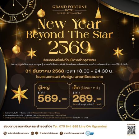 เริ่มต้นที่ โรงแรมแกรนด์ฟอร์จูน นครศรีธรรมราช Grand Fortune Hotel Nakhon Si Thammarat ส่งโปรฯเด็ด New Year Beyond the Star 2569 ร่วมฉลองคืนส่งท้ายปีเก่า 31 ธันวาคม 2568 กับงาน “New Year Beyond the Star 2569” เพลิดเพลินกับบุฟเฟ่ต์