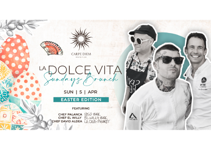 ตั้งแต่เวลา 12.00 – 15.00 น. La Dolce Vita Easter Brunch พร้อมมอบประสบการณ์เหนือระดับด้วยเมนูอาหารที่คัดสรรมาอย่างพิถีพิถัน จับคู่กับเครื่องดื่ม Bloody Mary สูตรพิเศษ พร้อมไฮไลต์สำคัญคือการรวมตัวกันของเชฟระดับแถวหน้าที่จะมาร่วมสร้างสรรค์เมนูสุดเอ็กซ์คลูซีฟ นำโดย เชฟ Álvaro Ramos (Palanca) จาก VASO Bangkok, เชฟ Willy Trullàs Moreno จาก El Willy Bangkok และ เชฟ David Aldea จาก La Cava Phuket ซึ่งแต่ละท่านจะนำเอกลักษณ์เฉพาะตัวมาผสมผสานเพื่อยกระดับมื้อสายวันอาทิตย์ให้มีความหรูหราแต่ยังคงความสนุกสนานในสไตล์ Carpe Diem