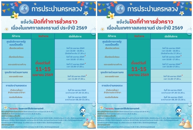เคาน์เตอร์บริการของ กปน. ที่ศูนย์บริการภาครัฐแบบเบ็ดเสร็จ ณ เซ็นทรัลแจ้งวัฒนะ หยุดให้บริการวันที่ 11-15 เมษายน 2569 เปิดให้บริการ 18 เมษายน 2569 (เปิดวันอังคาร ตั้งแต่เวลา 10.30-17.00 น. และวันเสาร์ ตั้งแต่เวลา 10.00 -17.00 น. ไม่เว้นวันหยุดนักขัตฤกษ์)
