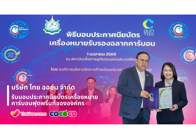 “ไทย ออซัม” คว้าประกาศนียบัตรเครื่องหมายคาร์บอนฟุตพริ้นท์องค์กร