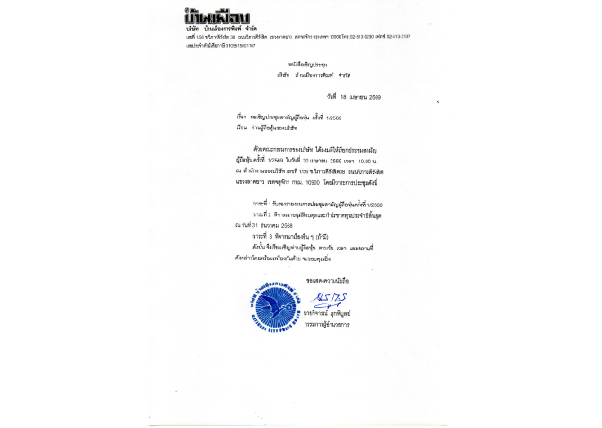 บริษัท บ้านเมืองการพิมพ์ จำกัด ขอเชิญประชุมสามัญผู้ถือหุ้น ครั้งที่ 1/2569