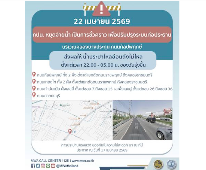 การประปานครหลวง (กปน.) ขอแจ้งให้ทราบว่า จะดำเนินการตามแผนปรับปรุงระบบท่อประธาน ในพื้นที่บริเวณคลองบางประทุน ถนนกัลปพฤกษ์ เพื่อให้ประชาชนได้รับบริการน้ำประปาอย่างเพียงพอและทั่วถึง จึงมีความจำเป็นต้องหยุดจ่ายน้ำ เป็นการชั่วคราว ในคืนวันพุธที่ 22 เมษายน 2569 ตั้งแต่เวลา 22.00 - 05.00 น. ของวันรุ่งขึ้น โดยระหว่างดำเนินการ ส่งผลให้ น้ำประปาไหลอ่อนถึงไม่ไหล ในพื้นที่ดังต่อไปนี้