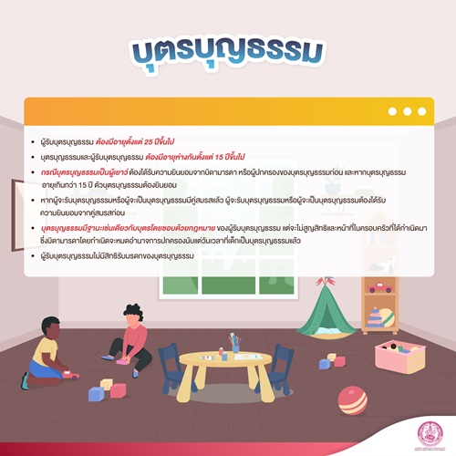 บุตรบุญธรรม กฎหมายจะให้ความคุ้มครองสิทธิเด็กให้มีฐานะอย่างเดียวกับบุตรที่ชอบด้วยกฎหมายของบิดา หรือมารดาบุญธรรมทันทีนับแต่วันที่จดทะเบียน เช่น มีสิทธิได้รับมรดก มีสิทธิใช้นามสกุลของบิดา หรือมารดาบุญธรรมโดยที่บิดา หรือมารดาบุญธรรมไม่มีสิทธิที่จะมารับมรดกของบุตรบุญธรรมนอกจากนี้แล้ว บุตรบุญธรรมยังไม่เสียสิทธิที่พึงมีตามกฎหมายในครอบครัวเดิมแต่อย่างใด คือ ยังมีสิทธิรับมรดกของบิดามารดาที่แท้จริงได้ และบิดามารดาที่แท้จริงมีสิทธิไปมาหาสู่เยี่ยมเยียนได้ตามสมควรทั้งนี้กฎหมายยังคุ้มครองเด็กโดยบิดา หรือมารดาบุญธรรมจะเลิกรับเด็กเป็นบุตรบุญธรรมได้ต้องได้รับความยินยอมจากบิดามารดาที่แท้จริงเสียก่อน และจะฟ้องให้มีการเลิกรับเด็กเป็นบุตรบุญธรรมโดยไม่มีเหตุอันควรไม่ได้