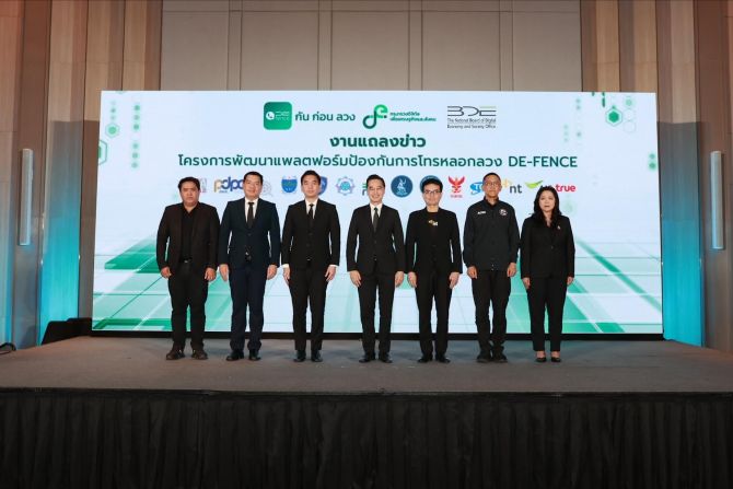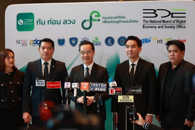 วันนี้ (15 มกราคม 2569) นายเวทางค์ พ่วงทรัพย์ เลขาธิการคณะกรรมการดิจิทัลเพื่อเศรษฐกิจและสังคมแห่งชาติ (BDE) และโฆษกกระทรวงดิจิทัลเพื่อเศรษฐกิจและสังคม (DE) ฝ่ายข้าราชการประจำ เป็นประธานงานแถลงข่าว “เปิดตัวแอปพลิเคชันป้องกันการโทรหลอกลวง” (DE-FENCE) ภายใต้โครงการพัฒนาแพลตฟอร์มป้องกันการโทรหลอกลวง โดยสำนักงานปลัดกระทรวงดิจิทัลเพื่อเศรษฐกิจและสังคม และสำนักงานคณะกรรมการดิจิทัลเพื่อเศรษฐกิจและสังคมแห่งชาติ บูรณาการความร่วมมือจากหน่วยงานที่เกี่ยวข้อง