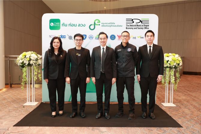 นายเวทางค์ พ่วงทรัพย์ เลขาธิการคณะกรรมการดิจิทัลเพื่อเศรษฐกิจและสังคมแห่งชาติ (BDE) และโฆษกกระทรวงดิจิทัลเพื่อเศรษฐกิจและสังคม (DE) เปิดเผยว่า “กระทรวงดิจิทัลเพื่อเศรษฐกิจและสังคม (DE) ร่วมกับสำนักงานคณะกรรมการดิจิทัลเพื่อเศรษฐกิจและสังคมแห่งชาติ (BDE) ซึ่งเป็นหน่วยงานของรัฐบาลที่มีพันธกิจในการส่งเสริมและพัฒนาดิจิทัลเพื่อขับเคลื่อนเศรษฐกิจและสังคมไทยให้เติบโตอย่างยั่งยืน โดยเน้นการพัฒนาเทคโนโลยีดิจิทัล และการปรับใช้โครงสร้างพื้นฐานดิจิทัล รวมถึงการสร้างความมั่นคงในโลกไซเบอร์ ได้เดินหน้าปราบปรามภัยออนไลน์อย่างเต็มกำลัง ซึ่งในวันนี้เป็นการเปิดตัวแพลตฟอร์มป้องกันการโทรหลอกลวง หรือ DE-FENCE ซึ่งเป็นเครื่องมือดิจิทัลที่ออกแบบมาเพื่อสกัดกั้นและแจ้ง “กัน-ก่อน-ลวง” เตือนภัยจากมิจฉาชีพที่มีกลโกงรูปแบบต่าง ๆ เพื่อเป็นการป้องกันมิจฉาชีพที่ใช้การโทรและการส่ง SMS หลอกลวงประชาชน ควบคู่กับมาตรการลงทะเบียนผู้ให้บริการส่ง SMS ใหม่ทั้งระบบ ซึ่งต้องมีการลงทะเบียนทุก ๆ ปี เพื่อให้สามารถระบุว่า ผู้ให้บริการและผู้ส่ง SMS คือใคร รวมทั้งการลงทะเบียนการส่ง SMS แนบลิงก์ จะต้องระบุรายละเอียดของข้อความและลิงก์ เพื่อให้ผู้ให้บริการเครือข่ายตรวจสอบลิงก์ก่อนที่จะส่ง SMS ไปยังผู้ใช้บริการ”