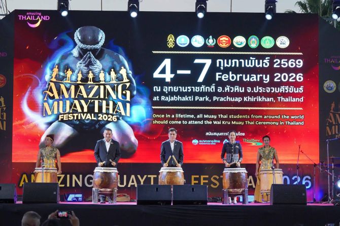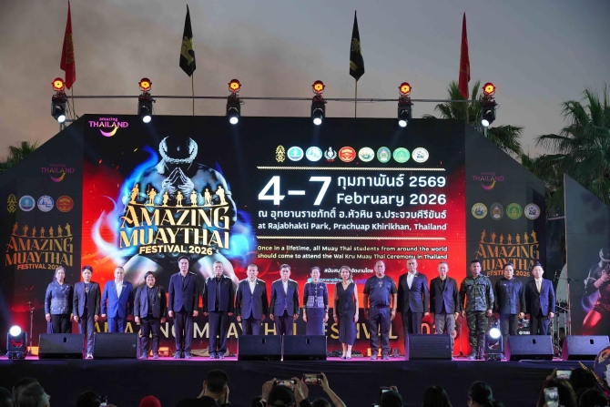 วันนี้ (4 กุมภาพันธ์ 2569) การท่องเที่ยวแห่งประเทศไทย (ททท.) ร่วมกับ จังหวัดประจวบคีรีขันธ์ กองทัพบก การกีฬาแห่งประเทศไทย กระทรวงวัฒนธรรม กรมประชาสัมพันธ์ มหาวิทยาลัยราชภัฏหมู่บ้านจอมบึง และสภามวยโลกมวยไทย (WBC) เปิดงาน“Amazing MuayThai Festival 2026” โดยมี นายณัฐ ครุฑสูตร รองผู้ว่าการด้านสินค้าและธุรกิจท่องเที่ยว ททท. เป็นประธานในพิธี พร้อมด้วย นางอภิญญา เอี่ยมอำภา รองผู้ว่าราชการจังหวัดประจวบคีรีขันธ์ และ พลเอก จินตมัย ชีกว้าง ผู้แทนผู้บัญชาการทหารบก ให้เกียรติเข้าร่วมงาน ณ อุทยานราชภักดิ์ อำเภอหัวหิน จังหวัดประจวบคีรีขันธ์ โดยงานจัดขึ้นวันที่ 4 – 7 กุมภาพันธ์ 2569 เพื่อถ่ายทอดเรื่องราวของมวยไทย สร้างแรงบันดาลใจให้แก่นักท่องเที่ยวคุณภาพที่ชื่นชอบกีฬามวยจากทั่วโลก พร้อมตอกย้ำภาพลักษณ์ประเทศไทยในฐานะจุดหมายปลายทางด้าน Sport Tourism ระดับนานาชาติ