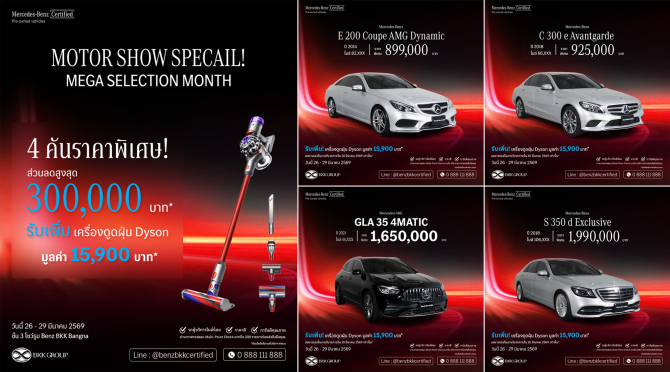 Benz BKK Group-Bangna ผู้แทนจำหน่ายและศูนย์บริการรถยนต์ Mercedes-Benz อย่างเป็นทางการ เปิดตัวแคมเปญ “MOTOR SHOW SPECIAL!” ภายใต้ไลน์ Mercedes-Benz Certified by Benz BKK Bangna เพื่อตอบรับช่วงเวลาสำคัญของอุตสาหกรรมยานยนต์อย่าง Motor Show ซึ่งเป็นช่วงที่ผู้บริโภคมีความต้องการและความพร้อมในการตัดสินใจสูง โดยนำเสนอข้อเสนอพิเศษสำหรับลูกค้าที่ต้องการเป็นเจ้าของรถยนต์เมอร์เซเดส-เบนซ์คุณภาพระดับพรีเมียม ในราคาที่เข้าถึงได้ พร้อมมาตรฐานการรับรองจากเมอร์เซเดส-เบนซ์ โดยงานจะจัดขึ้นระหว่างวันที่ 26 – 29 มีนาคม 2569 ณ ชั้น 3 โชว์รูม Benz BKK Bangna