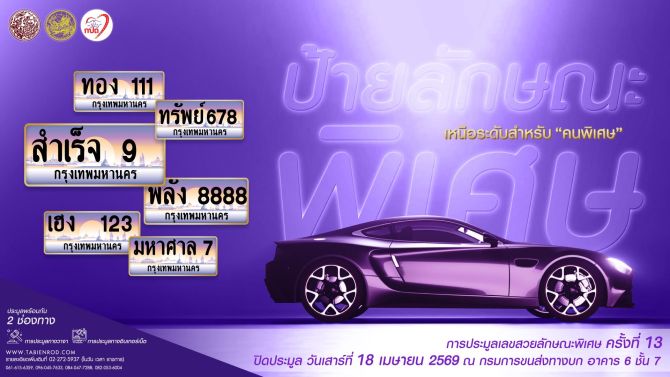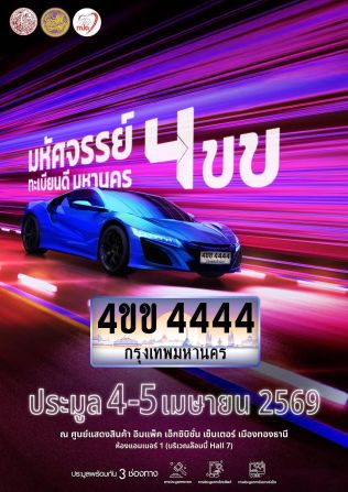 - กรมการขนส่งทางบก ชวนประมูลเลขทะเบียนรถเลขสวย “หมวดอักษรพิเศษ 4ขข” ในวันที่ 4-5 เม.ย. 69 3 เม.ย. 2569