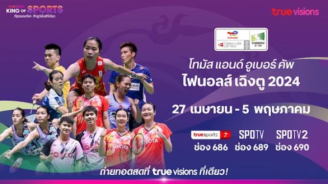 ทรูวิชั่นส์ ตอกย้ำการเป็นผู้นำคอนเทนต์กีฬาระดับโลก มอบโปรแกรมใหญ่โปรแกรมเด็ด ส่งท้ายเดือนเมษายน กับแบดมินตันชิงแชมป์โลกประเภททีมชาย และทีมหญิง รายการ โทมัส แอนด์ อูเบอร์ คัพ ไฟนอลส์ 2024 ที่เฉิงตู ประเทศจีน ร่วมเชียร์ทีมแบดมินตันของไทยทั้งทีมชาย และทีมหญิง ให้กำลังใจในการสู้เพื่อชัยชนะ ด้วยเกียรติยศ และศักดิ์ศรี สด สุดเอ็กซ์คลูซีฟ แบบเต็มอิ่ม เริ่ม 27 เมษายน - 5 พฤษภาคม นี้ ทาง True Sports7 (686), SPOTV (689) และ SPOTV2 (690)