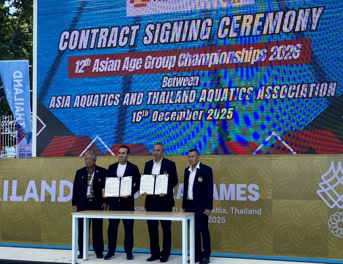 ฟาริด แฟททาเฮียน ผู้อำนวยการสหพันธ์กีฬาทางน้ำเอเชีย และ พล.อ.สุพล จันทร์ผ่อง อุปนายกสมาคมกีฬาทางน้ำแห่งประเทศไทย ร่วมกันเซ็นสัญญาให้ไทยเป็นเจ้าภาพการแข่งขันว่ายน้ำเอเชียนเอจกรุ๊ป 2026 โดยมี พล.ต.ดร.ธนนท์ แสงนาค อุปนายกสมาคม และ “โค้ชตึก” นายธนาวิชญ์ โถสกุล เลขาธิการสมาคมกีฬาทางน้ำแห่งประเทศไทย เป็นสักขีพยาน ที่สระว่ายน้ำ กกท.