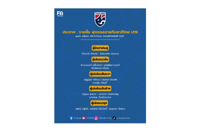 สมาคมกีฬาฟุตบอลแห่งประเทศไทย ในพระบรมราชูปถัมภ์ ประกาศรายชื่อ 14 นักฟุตซอลชายทีมชาติไทย รุ่นอายุไม่เกิน 19 ปี ทำการแข่งขันรายการ ASEAN U19 FUTSAL CHAMPIONSHIP 2025 ระหว่างวันที่ 22-28 ธันวาคม 2568 ณ ยิมเนเซียม อบจ.นนทบุรี