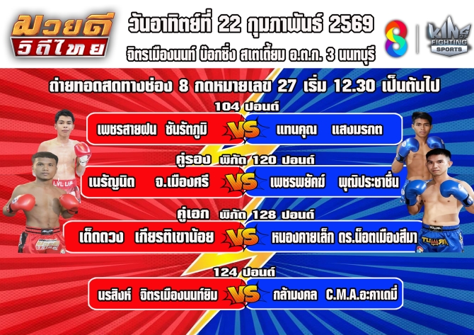รองคู่เอก พิกัด 120 ปอนด์ “เนรัญนิด จ.เมืองศรี” เปิดศึกกับ “เพชรพยัคฆ์ พุฒิประชาชื่น” อีกหนึ่งคู่ที่ต่างฝ่ายต่างหวังพิสูจน์ตัวเองบนเวทีใหญ่ ขณะเดียวกันยังเสริมความมันส์ด้วยอีก 2 คู่คุณภาพ ได้แก่ “เพชรสายฝน ซันรัตตภูมิ” พบ “แทนคุณ แสงมรกต” ในพิกัด 104 ปอนด์ และ “นรสิงห์ จิตรเมืองนนท์ยิมส์” ดวล “กล้ามงคล C.M.A. อะคาเดมี่” พิกัด 124 ปอนด์ ดังนั้นห้ามพลาดชม รายการ มวยดีวิถีไทย ในวันอาทิตย์ที่ 22 กุมภาพันธ์ กับรายการ มวยดีวิถีไทย เวลา 12.30 น. ทางช่อง 8 กดเลข 27