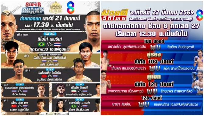 สถานีโทรทัศน์ช่อง 8 ชวนคอมวยตัวจริงพบ 2 รายการมันส์ ในวันเสาร์ที่ 21 มีนาคม ในรายการ มวยไทย Super Champ เวลา 17.30 น. และในวันอาทิตย์ที่ 22 มีนาคม กับรายการ มวยดีวิถีไทย เวลา 12.30 น. ที่จะชวนเหล่าแฟนมวยสนุกแบบลุ้นระทึกอัดแน่นกับเหล่านักมวยฝีมือดี