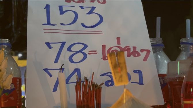 ปรากฏว่าน้ำตาเทียนหยดลงในขันน้ำมนต์เกิดเป็นตัวเลขชัดเจน 3 ตัว ทำให้ผู้ร่วมพิธีต่างพากันลุกขึ้นมามุงดูด้วยความตื่นเต้น ก่อนที่อาจารย์จะเด็ดจะจดตัวเลขดังกล่าวลงบนกระดาษ เป็นเลขสามตัวและสองตัว ได้แก่ 153, 78 และ 74