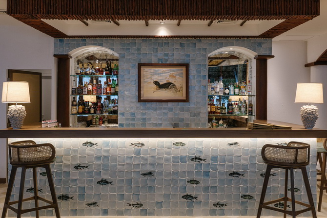 ส่วน ออตเตอร์ บาร์ ซึ่งตั้งอยู่ในอีกมุมหนึ่งของห้องอาหารที่เชื่อมต่อกันเป็นหนึ่งเดียว ก็มาพร้อมกับรูปลักษณ์ชวนสะดุดตา ด้วยการหยิบเอากระเบื้องสีฟ้าอ่อนสดใสมาร้อยเรียงประสานกันจนออกมาเป็นลวดลายประณีตงดงามคล้ายกับเกล็ดปลาที่กำลังแหวกว่ายในมหาสมุทร พร้อมที่นั่งให้เอนกายพักผ่อนพร้อมเครื่องดื่มแก้วโปรดกว่า 20 ที่นั่ง และเพลิดเพลินไปกับการบรรเลงเปียโนพร้อมขับกล่อมบทเพลงอันไพเราะจากนักร้องมืออาชีพ
